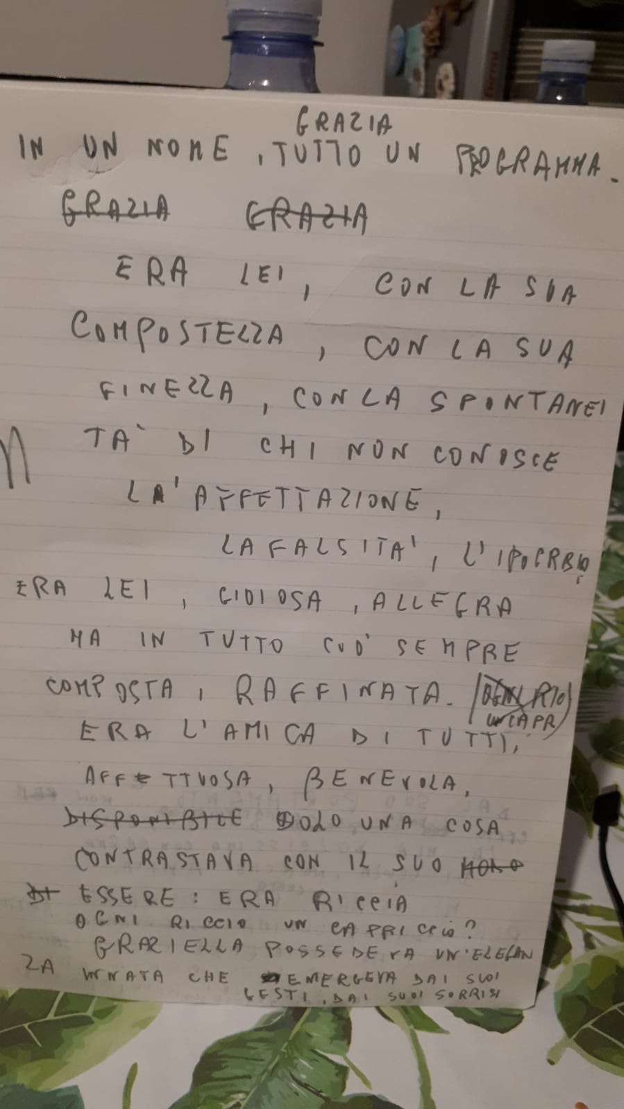 “GRAZIA in un nome, tutto un programma. Era lei, con la sua compostezza, con la sua finezza, con la spontaneità di chi non conosce l’ affettazione, la falsità, l’ipocrisia. Era lei, gioiosa, allegra ma, in tutto ciò, sempre composta, raffinata. Era l’amica di tutti, affettuosa e benevola. Solo un particolare contrastava con il suo modo di essere: era riccia e allora…”A ogni riccio un capriccio?” ci si potrebbe chiedere. Graziella possedeva un’ eleganza innata che emergeva dai suoi gesti, dai suoi sorrisi, dal suo comportamento e non certo dalla caratteristica dei suoi capelli. La mia dolcissima compagna di scuola, nonché amica, mi vorrà certo perdonare per quest’ ultima battuta che ho voluto fare prepotentemente perché sono certa che lei, oggi, riderebbe di ciò con me. Ciao, Graziella!”